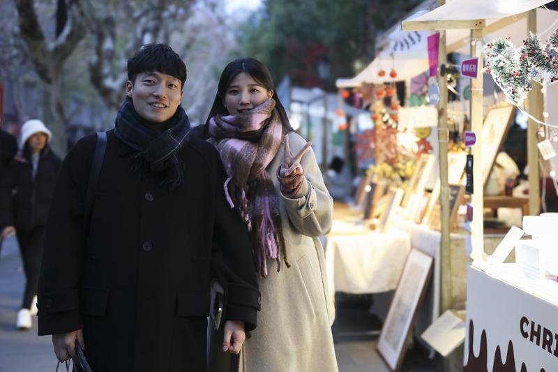 2024年12月25日,韩国旅客周玟佑(左)和金叡恩在上海新寰宇周边合影。